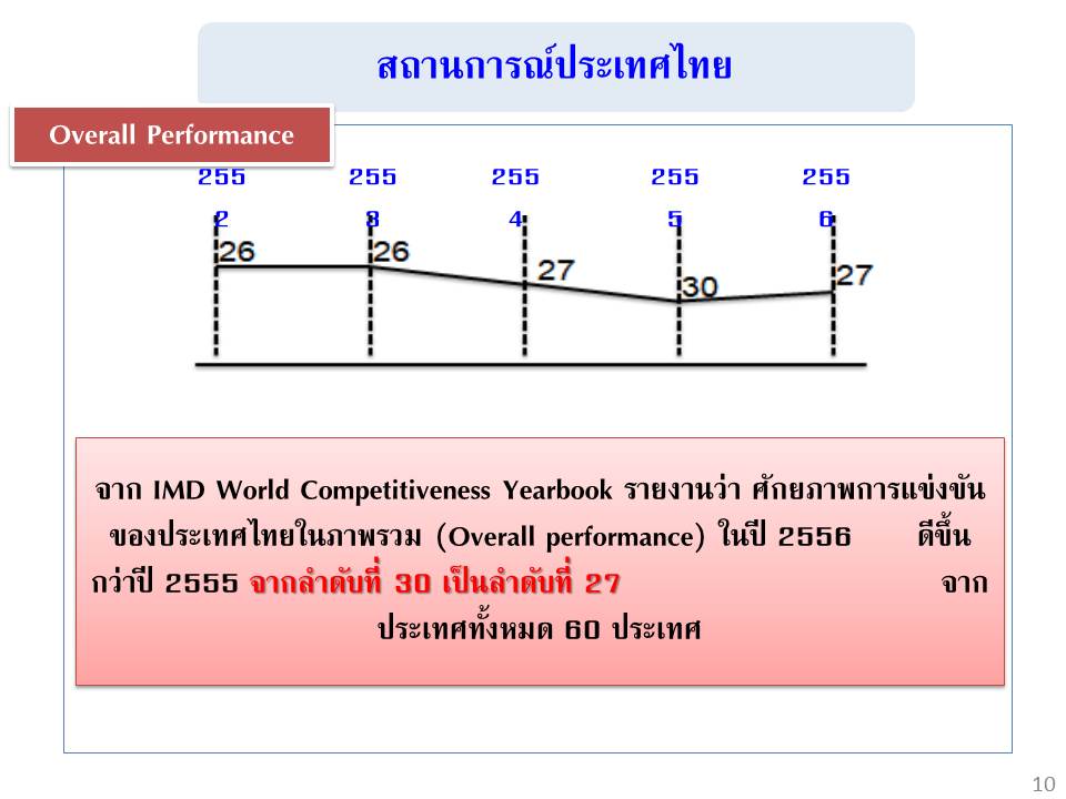 จาก IMD World Competitiveness Yearbook 2013 ศักยภาพการแข่งขันของประเทศไทยในภาพรวม (Overall performance) ในปี 2556 ดีขึ้นกว่าปี 2555 จากลำดับที่ 30 เป็นลำดับที่ 27 จากประเทศทั้งหมด 60 ประเทศความสามารถในการแข่งขันทางด้านเศรษฐกิจ ประสิทธิภาพของรัฐบาลและภาคธุรกิจ ดีขึ้นอย่างเป็นที่น่าพอใจ มีเพียงสถานะทางโครงสร้างพื้นฐานที่ดีขึ้นเพียงเล็กน้อยเท่านั้น รัฐบาลจึงต้องลงทุนเพิ่มเติมทั้งโครงสร้างพื้นฐานทั่วไป รวมถึง วิทยาศาสตร์และเทคโนโลยี งานวิจัย และโครงสร้างพื้นฐานอื่นๆ