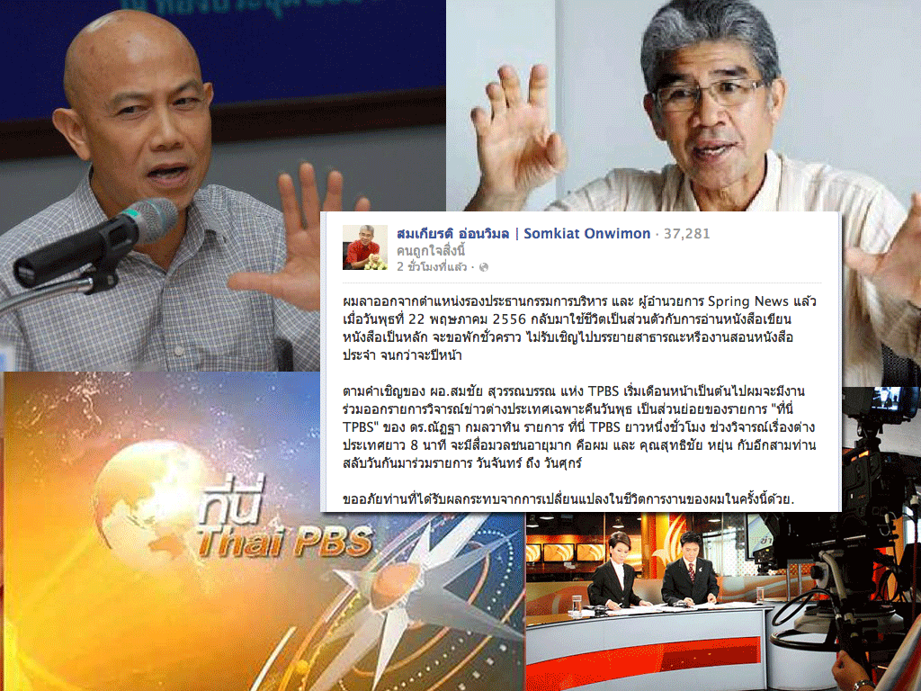 "ผม ลาออกจากตำแหน่งรองประธานกรรมการบริหาร และ ผู้อำนวยการ Spring News แล้วเมื่อวันพุธที่ 22 พฤษภาคม 2556 กลับมาใช้ชีวิตเป็นส่วนตัวกับการอ่านหนังสือเขียนหนังสือเป็นหลัก จะขอพักชั่วคราว ไม่รับเชิญไปบรรยายสาธารณะหรืองานสอนหนังสือประจำ จนกว่าจะปีหน้า ตามคำเชิญของ ผอ.สมชัย สุวรรณบรรณ แห่ง TPBS เริ่มเดือนหน้าเป็นต้นไปผมจะมีงานร่วมออกรายการวิจารณ์ข่าวต่างประเทศเฉพาะ คืนวันพุธ เป็นส่วนย่อยของรายการ "ที่นี่ TPBS" ของ ดร.ณัฏฐา กมลวาทิน รายการ ที่นี่ TPBS ยาวหนึ่งชั่วโมง ช่วงวิจารณ์เรื่องต่างประเทศยาว 8 นาที จะมีสื่อมวลชนอายุมาก คือผม และ คุณสุทธิชัย หยุ่น กับอีกสามท่านสลับวันกันมาร่วมรายการ วันจันทร์ ถึง วันศุกร์ ขออภัยท่านที่ได้รับผลกระทบจากการเปลี่ยนแปลงในชีวิตการงานของผมในครั้งนี้ ด้วย."