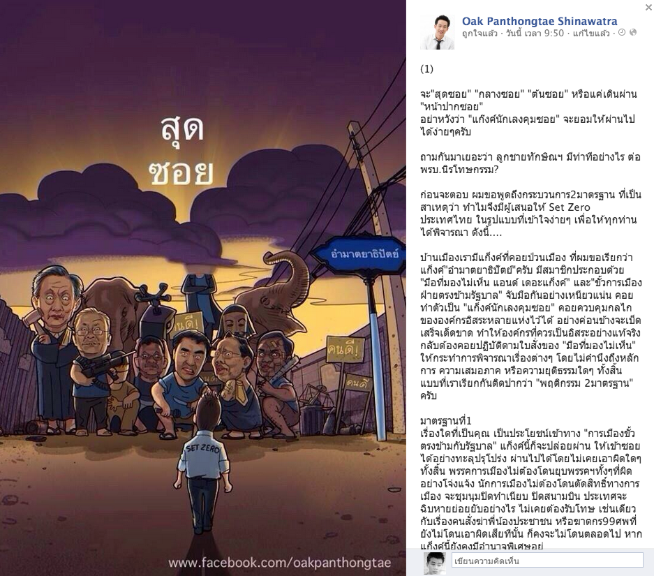 วันที่ 27 ตุลาคม 2556 go6TV – ผู้สื่อข่าวรายงานว่า นายพานทองแท้ ชินวัตร บุตรชาย พ.ต.ท.ดร.ทักษิณ ชินวัตร อดีตนายกรัฐมนตรี ได้โพสต์ข้อความผ่านเฟสบุ๊กส่วนตัว https://www.facebook.com/oakpanthongtae โดยมีเนื้อหาดังนี้