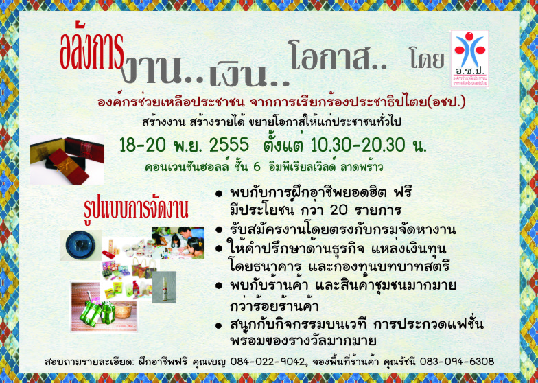 โดย.. องค์กรช่วยเหลือประชาชน จากการเรียกร้องประชาธิปไตย(อ.ช.ป.) ติดต่อสอบถาม จองพื้นที่ร้านค้า ติดต่อคุณรัชนี 083-094-6308 ฝึกอาชีพฟรี ติดต่อคุณเบ็ญ 084-022-9042
