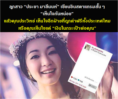 ลูกสาวของนายประชา มาลีนนท์ "ตู่ ปิยวดี มาลีนนท์" ผู้ช่วยกรรมการผู้จัดการ ที่ดูแลทางด้านละครและเป็นผู้จัดละครได้โพสต์ข้อความผ่าน instagram "เห็นใจกันหน่อย" ประโยค