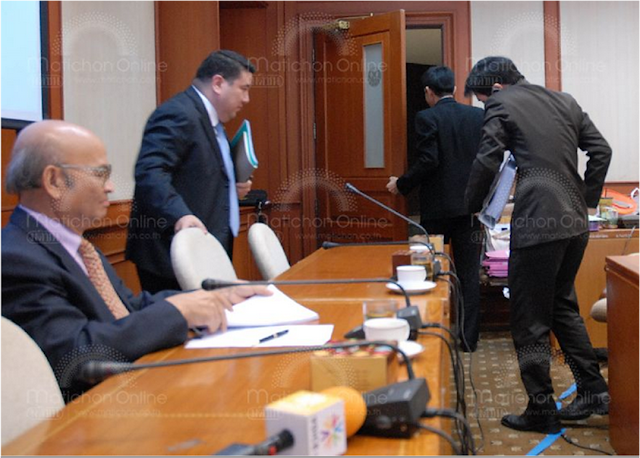 ภาพขณะเจ้าหน้าที่ดีเอสไอ โดนนาย วัชระ เพชรทอง ประธานคณะอนุกรรมาธิการฯ ไล่ออกจากห้องประชุมที่รัฐสภา