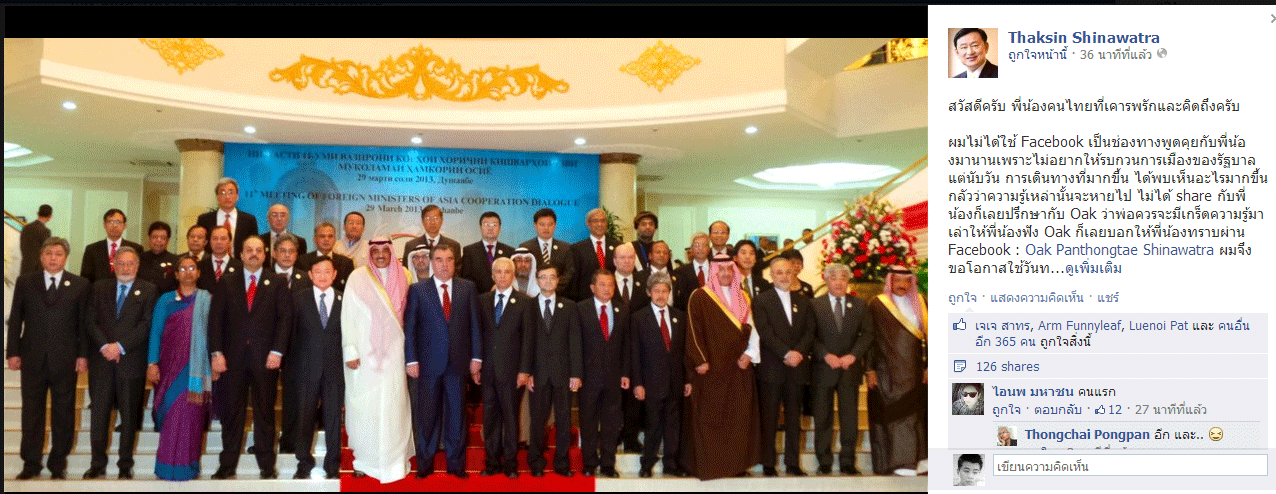ชินวัตร อดีตนายกรัฐมนตรี ได้โพสต์ข้อความผ่านเฟสบุ๊ค https://www.facebook.com/thaksinofficial