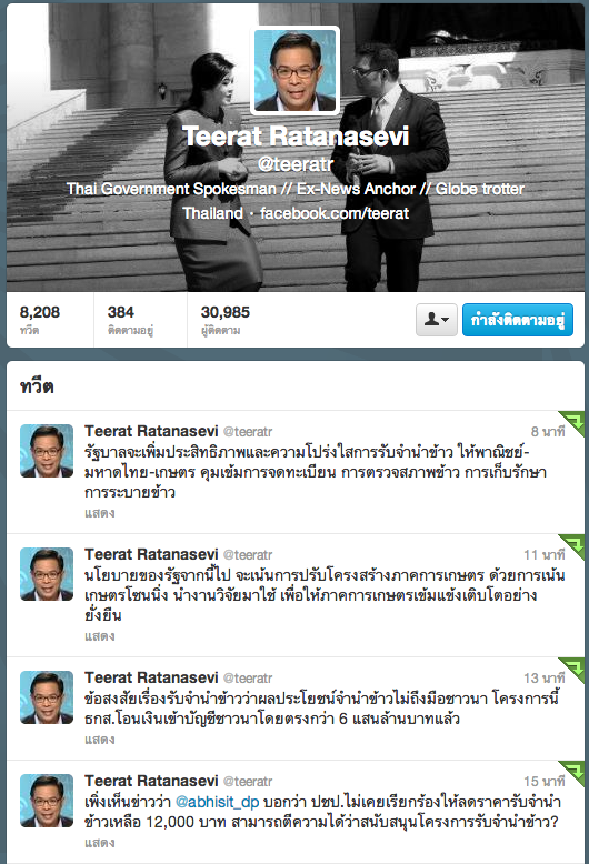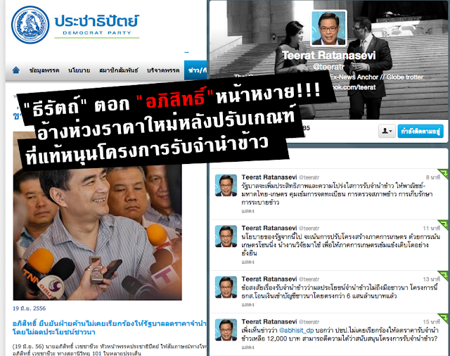 20 มิถุนายน 2556 go6TV - ผู้สื่อข่าวรายงานว่า เมื่อช่วงกลางดึกที่ผ่านมา นายธีรัตถ์ รัตนเสวี โฆษกประจำสำนักนายกรัฐมนตรี โพสต์ข้อความผ่านทวิตเตอร์ส่วนตัว https://twitter.com/teeratr เกี่ยวกับ "โครงการรับจำนำข้าว" ล่าสุด โดยมีเนื้อหาดังนี้