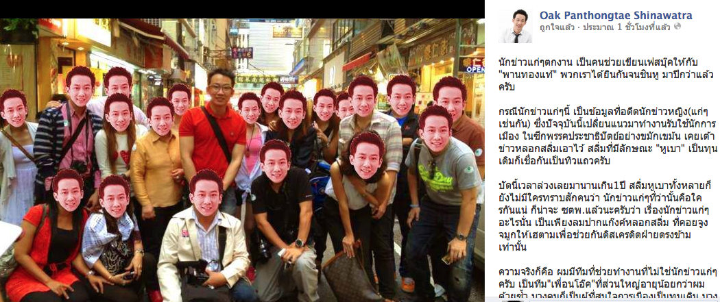 2 มิถุนายน 2556 go6TV ผู้สื่อข่าวรายงานว่า เมื่อเวลา 13.30น. ที่ผ่านมา นายพานทองแท้ ชินวัตร บุตรชาย พ.ต.ท.ดร.ทักษิณ ชินวัตร อดีตนายกรัฐมนตรี โพสต์ข้อความผ่านเฟสบุ๊กส่วนตัว https://www.facebook.com/oakpanthongtae โดยระบุว่า "ทีมเพื่อนโอ๊ค"