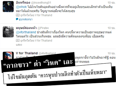 เมื่อ "วิหค" สู้ ไปประกาศในรายการโทรทัศน์ เชิญชวนถอดหน้ากาก ฝ่าย V For Thailand ถึงขนาดฟิวส์ขาดด่ากราดกลางทวิตเตอร์ "ไอ้อ้วนไขมันอุดตัน อย่างมึงควรที่จะอยู่เงียบๆ และเลิกทำตัวเป็นเห็บหมาได้แล้ว วิณญาณพ่อมึงจะได้อยู่สงบสุข" แรงส์ๆๆๆ
