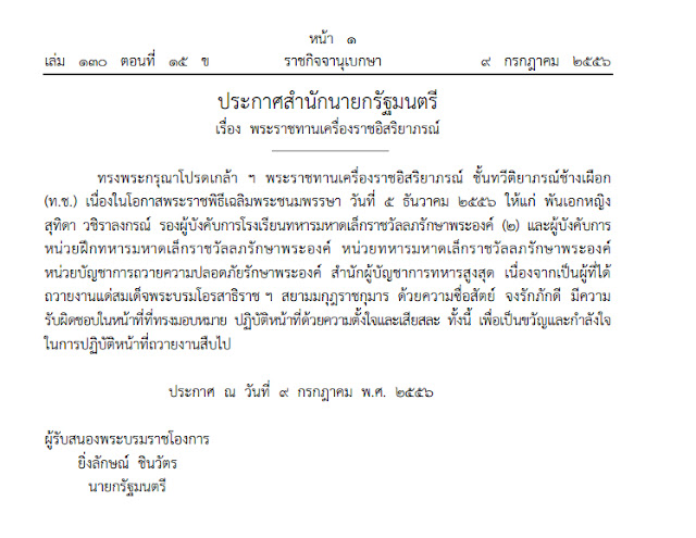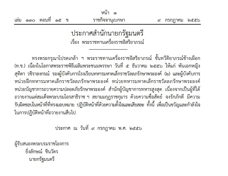 พระราชทานเครื่องราชฯพ.อ.หญิงสุทิดา วชิราลงกรณ์ ผู้ถวายงานพระบรมฯด้วยความจงรักภักดี