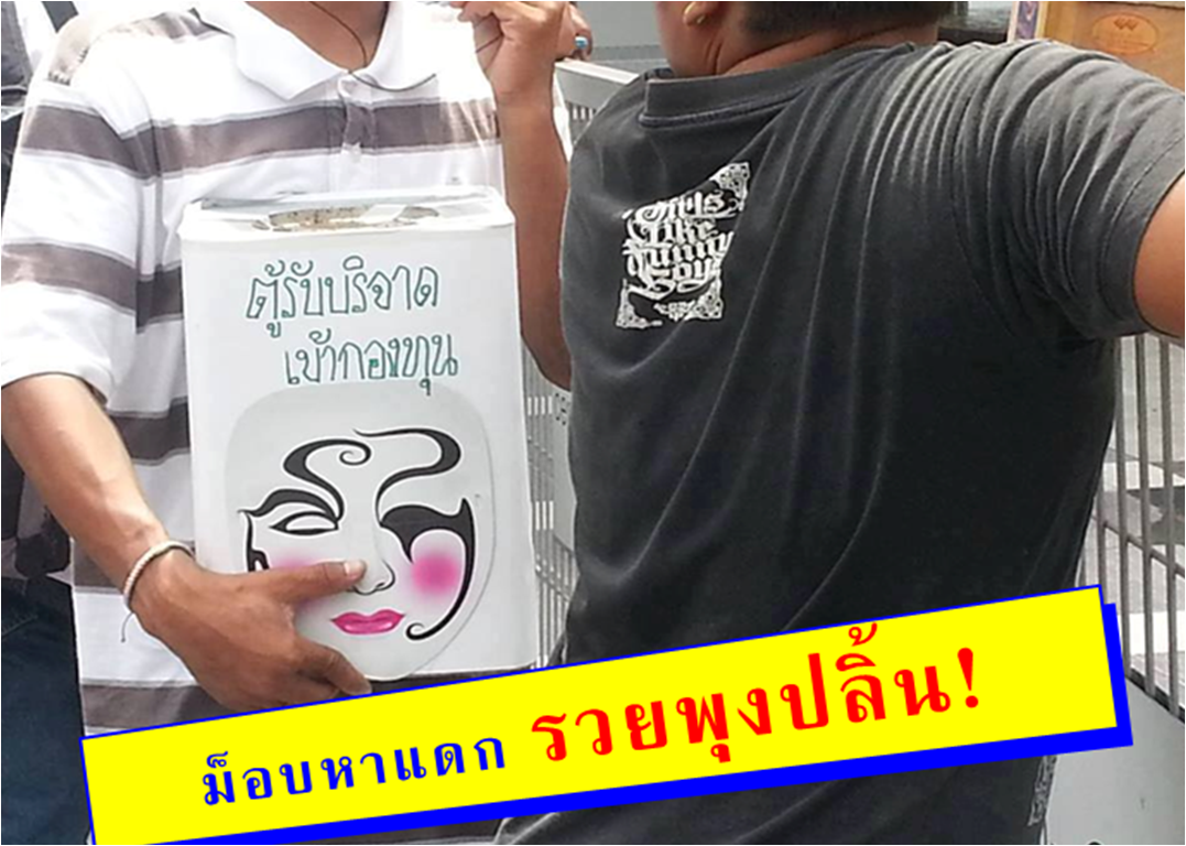ยืนขอรับบริจาคเงินโดยมีข้อความเขียนบนกล่องว่า “ตู้รับบริจาค หน้ากากขาว