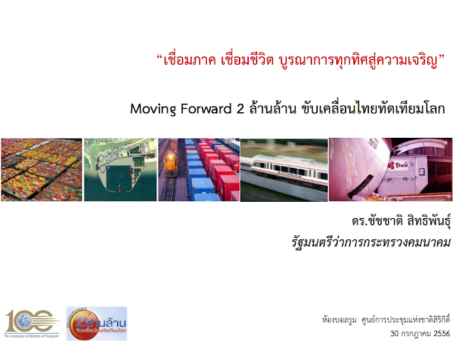 31 กรกฏาคม 2556 go6TV - กองบรรณาธิการ go6TV นำเสนอ ต้นฉบับเอกสารงานนำเสนอ (Microsoft PowerPoint) จำนวน 123 หน้า โดย นายชัชชาติ สิทธิพันธ์ รัฐมนตรีว่าการกระทรวงคมนาคม ปาฐกถาพิเศษ ในหัวข้อ "เชื่อมภาค เชื่อมชีวิต บูรณาการทุกทิศสู่ความเจริญ" งาน "Moving Forward 2 ล้านล้าน ขับเคลื่อนไทยทัดเทียมโลก" ณ ห้องบอลรูม ศูนย์การประชุมแห่งชาติสิริกิติ์ ซึ่งจัดโดยสำนักบริหารหนี้สาธารณะ (สบน.) กระทรวงการคลัง และกระทรวงคมนาคม วานนี้ ตามลิงค์นี้ http://sdrv.ms/13YV697