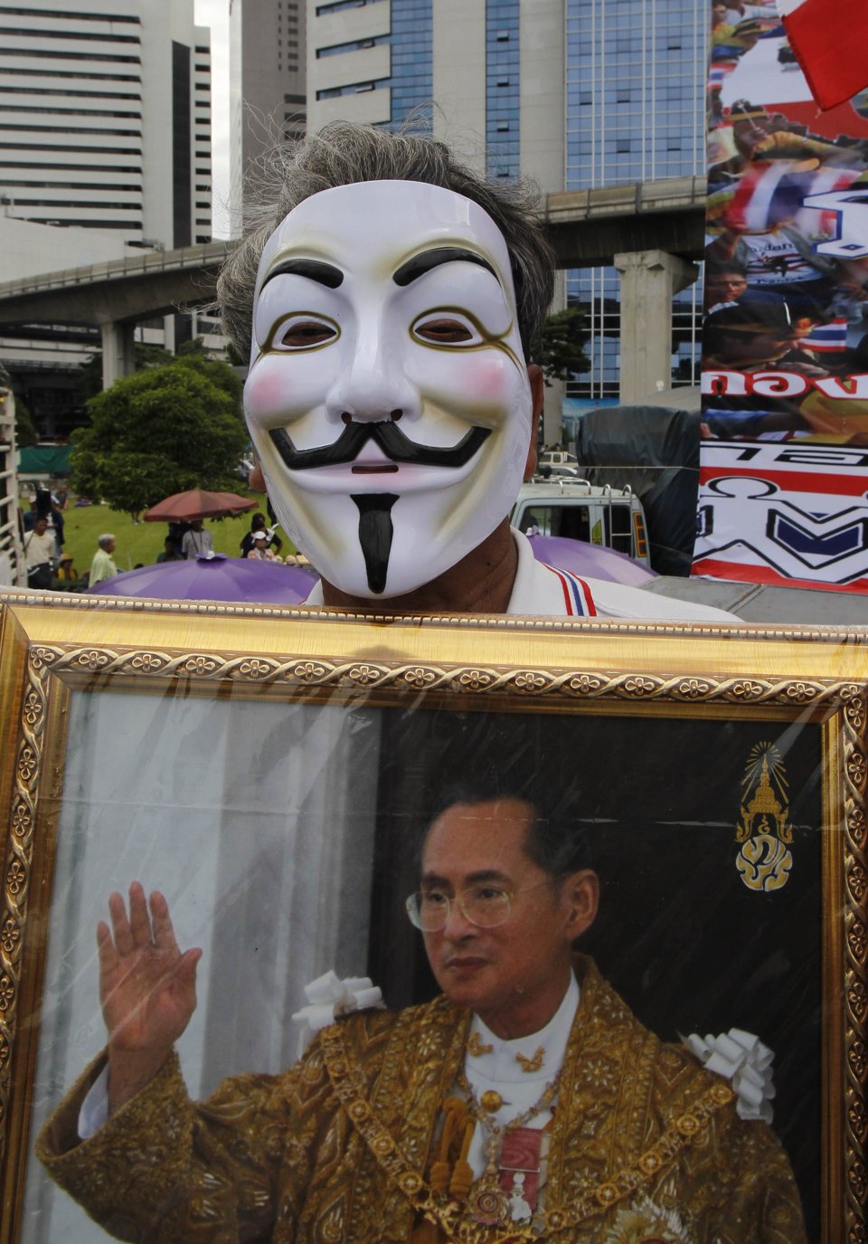 ผู้ชุมนุมสวมใส่หน้ากากขาวถือพระบรมฉายาลักษณ์กษัตริย์ภูมิพล ที่สวนลุมพินี