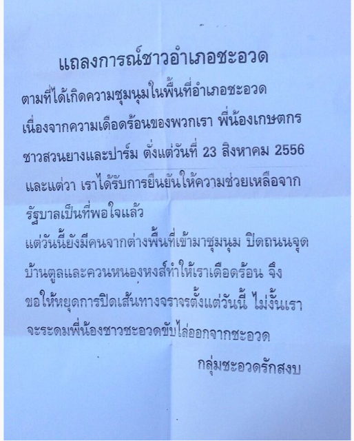 "แถลงการณ์ชาวอำเภอชะอวด ตามที่ได้เกิดความชุมนุมในพื้นที่อำเภอชะอวด เนื่องจากความเดือดร้อนของพวกเรา ชาวสวนยางและปาร์ม ตั้งแต่ 23สิงหาคม 2556 และแต่ว่าเราได้รับการยืนยันความช่วยเหลือจากรัฐบาลเป็นที่พอใจแล้ว และวันนี้ยังมีคนจากต่างพื้นที่เข้ามาชุมนุม ปิดถนนจุดบ้านตูลและควนหนองหงส์ทำให้เราเดือดร้อน จึงขอให้หยุดการปิดเส้นทางจราจรตั้งแต่วันนี้ ไม่งั้นเราจะระดมพี่น้องชาวชะอวดขับไล่ออกจากชะอวด กลุ่มชะอวดรักสงบ"