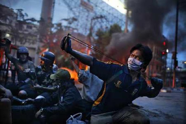 REUTERS-ผู้ประท้วงใช้บั้งไฟตะไลยิงสู้ทหารแบบตามมีตามเกิด เมื่อวันเสาร์15พ.ค.