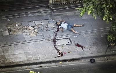 AP-ภาพชายไทยถูกยิงและนอนหลบบนฟุตบาทโดยฝีมือของสไนเปอร์ไม่ทราบสังกัด