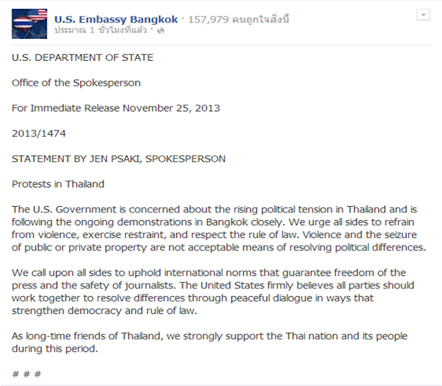 การต่างประเทศสหรัฐอเมริกาออกแถลงการณ์ถึงสถานการณ์การชุมนุมในประเทศไทย