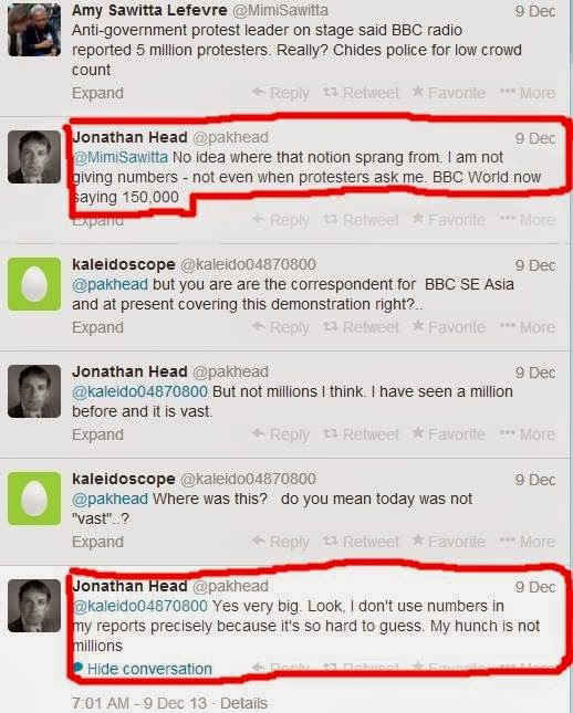 Jonathan Head ผู้สื่อข่าวหลักของ BBC ทวิตตั้งแต่วันที่ 9 ธ.ค.ระบุเองว่า ในการรายงานข่าว เขาไม่ได้ใช้คำว่า “5 ล้าน” ส่วนเนื้อหาข่าวใน BBC รายงานตัวเลข 150,000 คน เขาบอกเคยเห็นคนชุมนุมล้านค