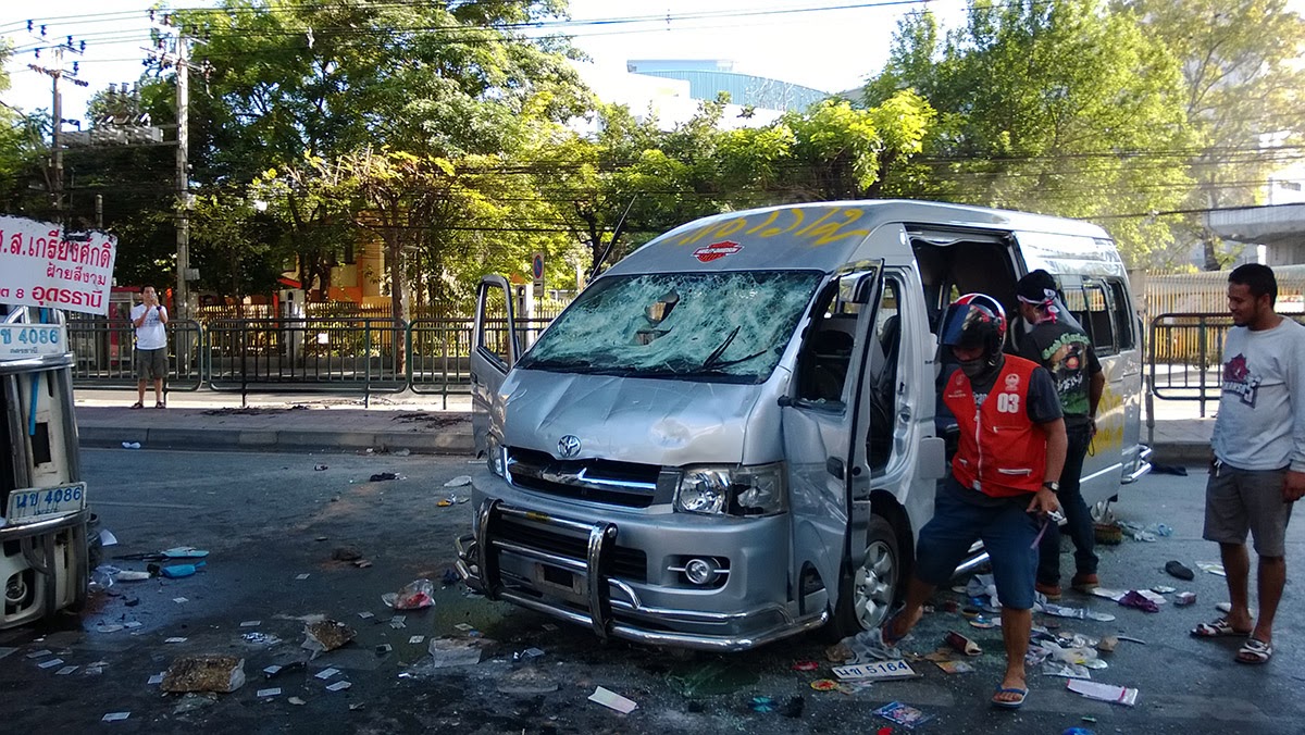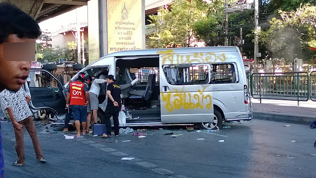 เคาะหาของตามลำตัวรถ) รถตู้ สองคันที่ล้มอยู่ ซึ่งมีคนยืนดูอยู่