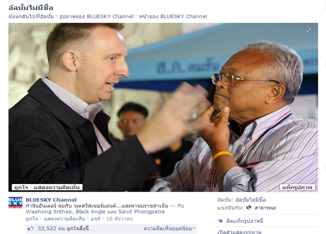 วัน ที่ 20 ธันวาคม 2556 ผู้ชายฝรั่ง ผู้ถูกเวทีม็อบกบฏสุเทพ แอบอ้างว่าเป็นทูตสวิสเซอแลนด์ และเพจบลูสกาย บอกว่าเป็นทูตสวิสเซอร์แลนด์ ได้เขียนข้อความชี้แจงว่า ตนเป็นเอ็นจีโอระหว่างประเทศ ไม่ได้เป็นทูตและก็ไม่รู้ว่าทำไมม็อบไปพูดว่าเป็นทูต