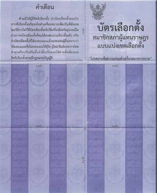 * บัตรเลือกตั้งแบบแบ่งเขต จะเป็น "สีม่วง" และ