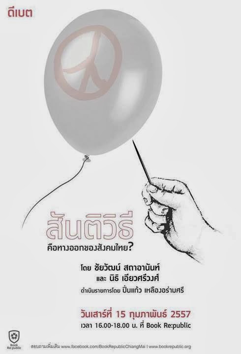 เสาร์ที่ 15 กพ. นี้ เชิญชวนผู้สนใจมาฟังและแลกเปลี่ยนกันในเสวนา "สันติวิธีคือทางออกของสังคมไทย?" โดย อ.นิธิ เอียวศรีวงศ์ และ อ.ชัยวัฒน์ สถาอานันท์ เวลา 16.00-18.00 น. Book Re:public ค่ะ