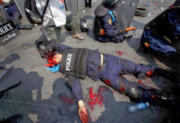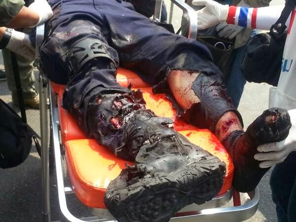 | เจ้าหน้าที่ตำรวจที่ได้รับบาดเจ็บบริเวณสะพานผ่านฟ้า จากบาดแผลน่าจะเกิดจากแรงระเบิด |