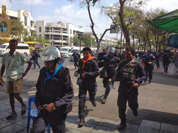 | จนท.ตร. วิ่งกรูผ่านแยกคอกวัว ทิ้งกระบอง-โล่ หลังรับแจ้งมีคนยิงระเบิดใส่ ที่ผ่านฟ้า |