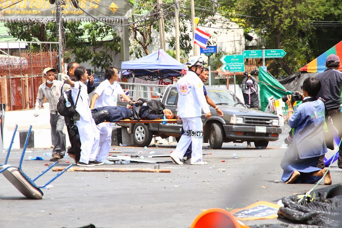 | มีการยิงปะทะจาก จนท.ใส่ผู้ชุมนุมตอนนี้มีผู้บาดเจ็บหลายราย จนท.กู้ภัยทยอยนำส่ง รพ. |