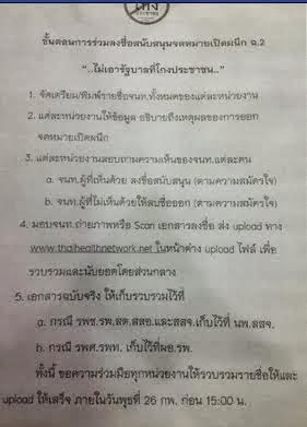 2 ขณะเดียวกัน ในกลุ่ม โรงพยาบาลอำเภอและโรงพยาบาลประจ ำตำบล รวมทั้งสถานีอนามัย ทั่วประเทศ ก็ได้มีการสั่งการผ่านไปทาง นายแพทย์สาธารณสุขจังหวัดในทุ กๆจังหวีดให้ดำเนินการล่ารายชื่ อแบบเดียวกัน