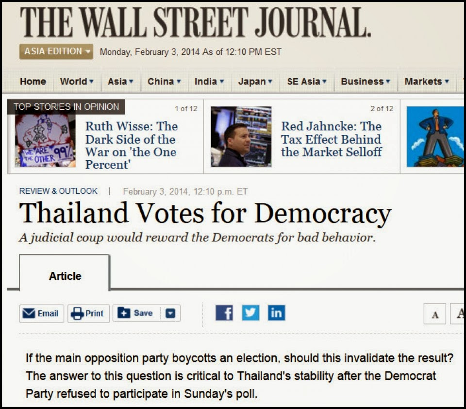 ตีพิมพ์บทบรรณาการในฉบับวันที่ 3 กุมภาพันธ์ เรื่อง "Thailand votes for