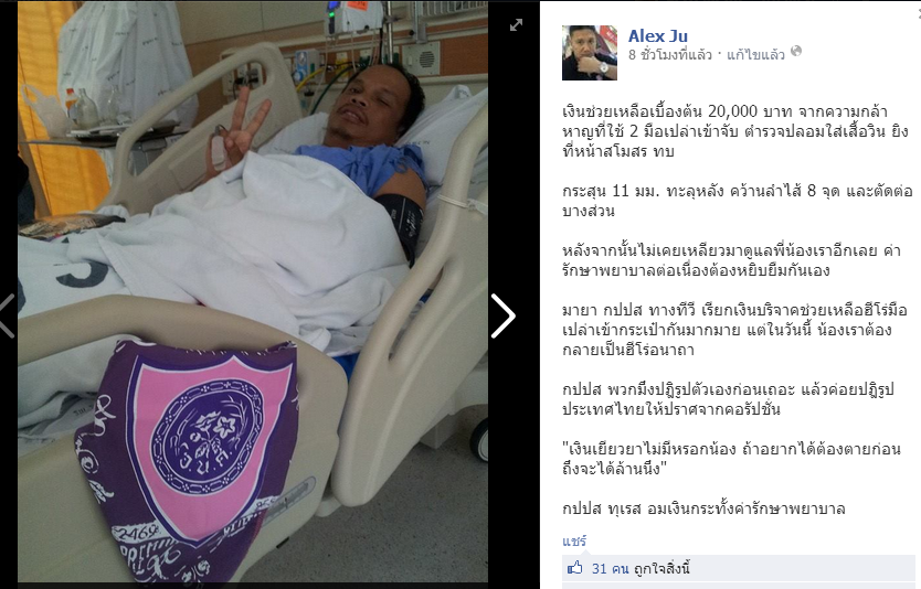 ยิงที่หน้าสโมสร ทบ กระสุน 11 มม. ทะลุหลัง คว้านลำไส้ 8 จุด และตัดต่อบางส่วน หลังจากนั้นไม่เคยเหลียวมาดูแลพี่น้องเราอีกเลย