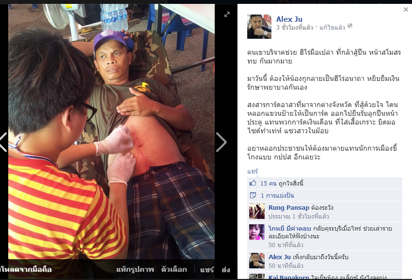 ผู้ใช้ไอดี Alex Ju ซึ่งเป็นการ์ด กปปส. ได้เขียนข้อความบนเฟสบุ้คแฉความเน่าเฟะ