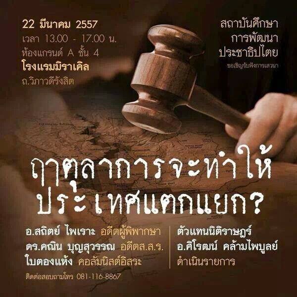 ขอเชิญรับฟังการเสวนา ฤาตุลาการจะทำให้ประเทศแตกแยก? 22 มีนาคม 13.00 น. โรงแรมมิราเคิล