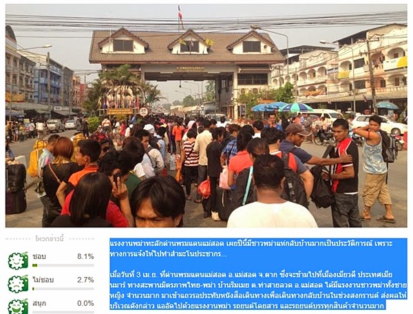 ภาพและข่าวจริงจากไทยรัฐออนไลน์-พม่านับหมื่นแห่กลับบ้าน ผ่านชายแดนแม่สอด ดูลิ้งค์ข่าว http://www.thairath.co.th/content/414208 แรงงานพม่าทะลักด่านพรมแดนแม่สอด เผยปีนี้มีชาวพม่าแห่กลับบ้านมากเป็นประวัติการณ์ เพราะทางการแจ้งให้ไปทำสำมะโนประชากร...